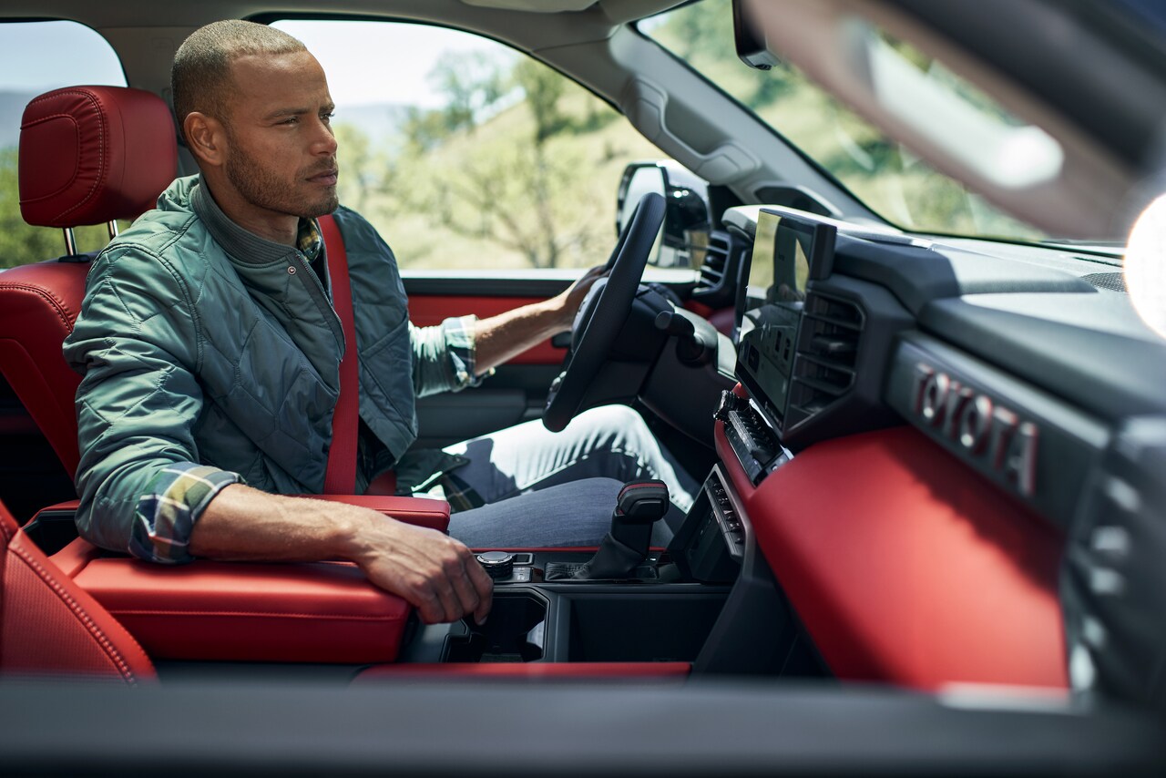 Inside the Toyota Tundra's spacious cabin, you'll find premium materials, comfortable seating, and user-friendly controls. CrewMax models provide ample room for five adults, while the power-sliding rear window and available panoramic roof let in plenty of fresh air and natural light. Luxurious amenities like leather-trimmed seats, heated and ventilated front seats, and a heated steering wheel are also available on upper trims like Limited, Platinum, and the western-inspired 1794 Edition.